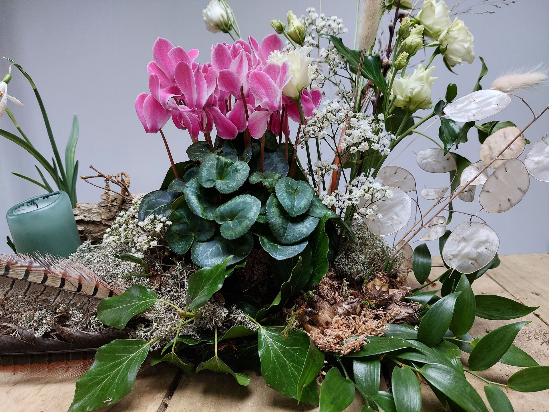 The workshops are very relaxed and groups are kept small (9 as a maximum), ensuring enough individual tuition. Each workshop starts with a demonstration, whilst you enjoy tea, coffee and biscuits. You will then be supported in making your own masterpiece. You can choose between a round or vertical design and whether you would like to include candles or not. We use only sustainable materials and you can re-use the base for future floral projects and replant your bulbs in a pot or garden afterwards.